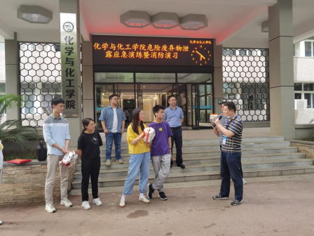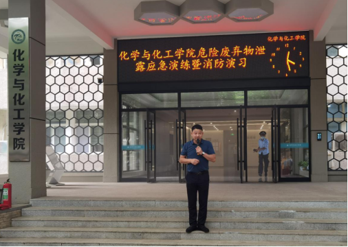 演练活动开始,朱启军就开展化学废弃物泄露演练及消防演习的重要性和必要性做了细致讲解,毛天音从化学楼内消防安全应急措施和预案、以及如何加强人员和物品管理等多个方面做了详细说明。