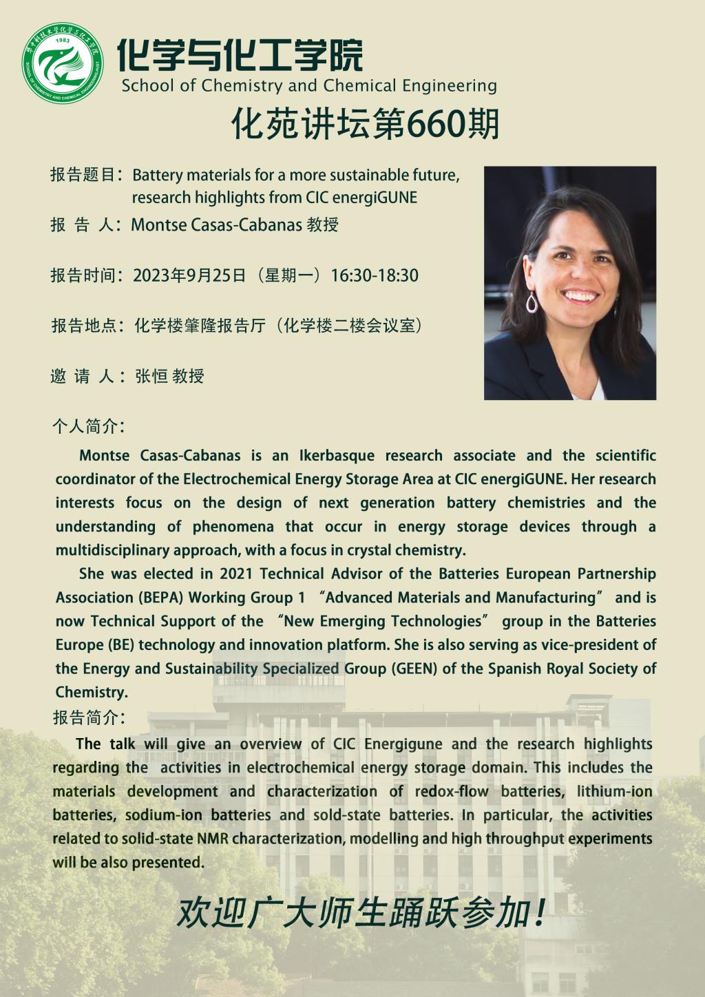 西班牙能源合作研究中心Montse Casas-Cabanas 教授做客第660期化苑讲坛