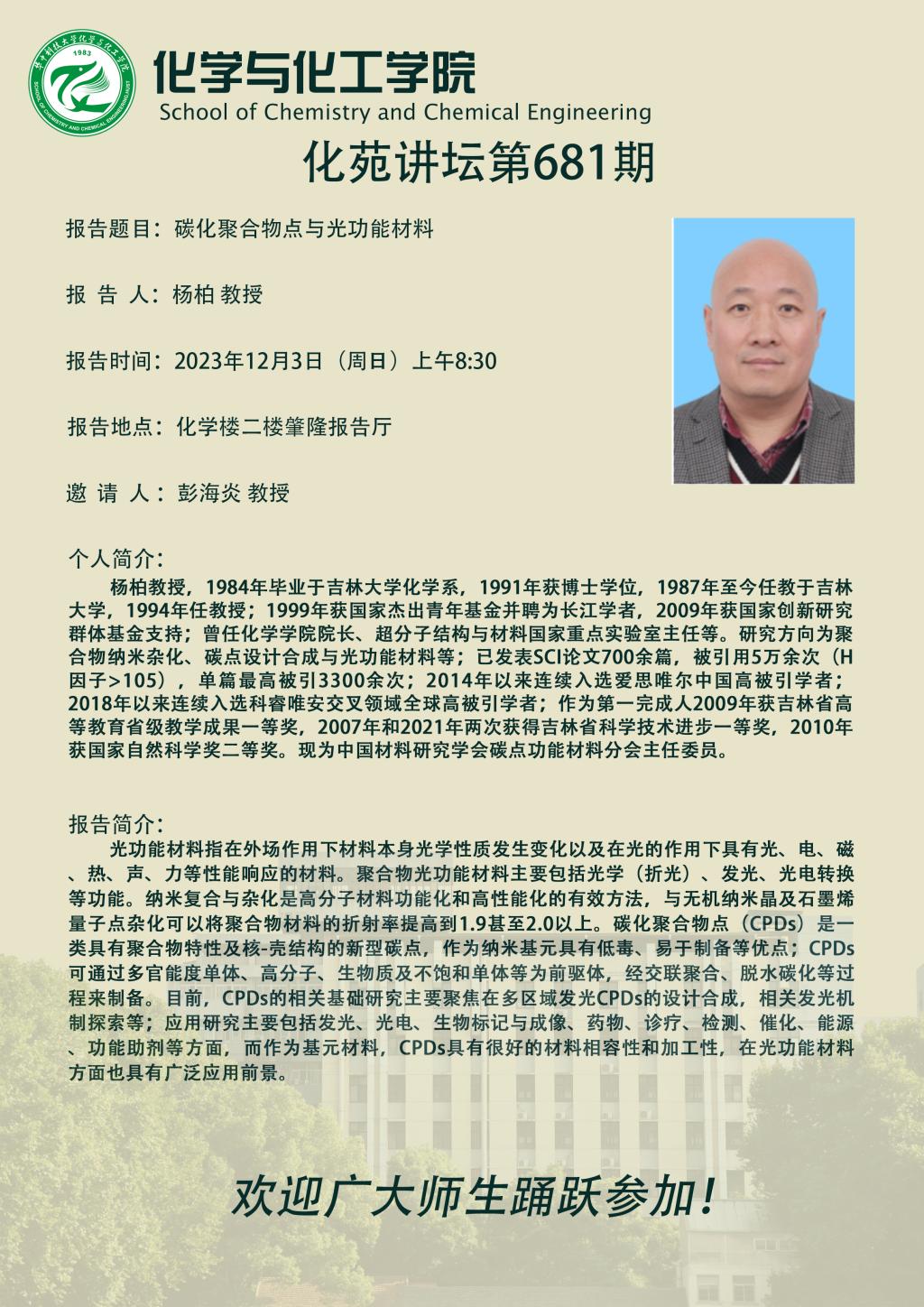 吉林大学杨柏教授做客第681期化苑讲坛