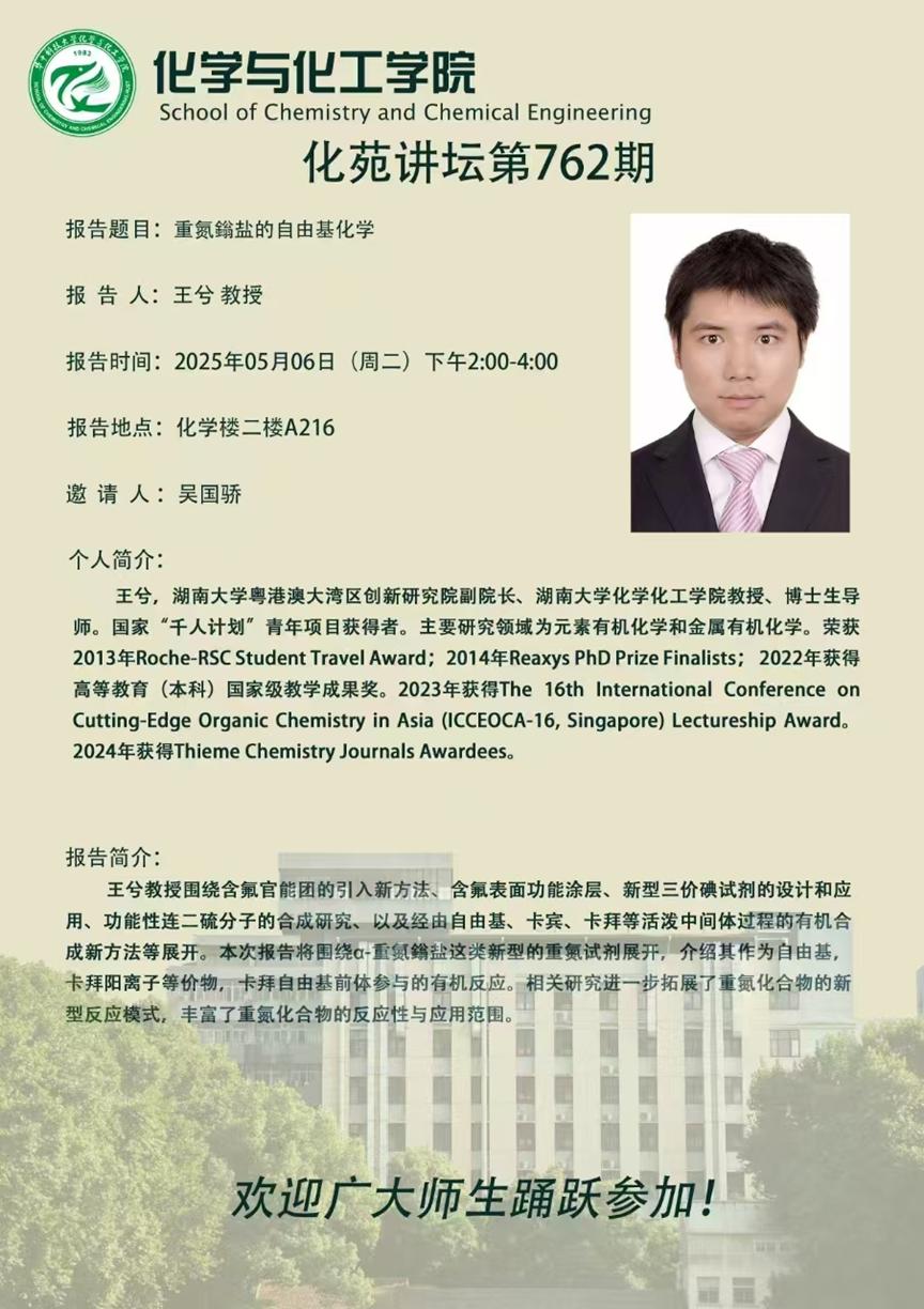 湖南大学王兮教授做客第762期化苑讲坛