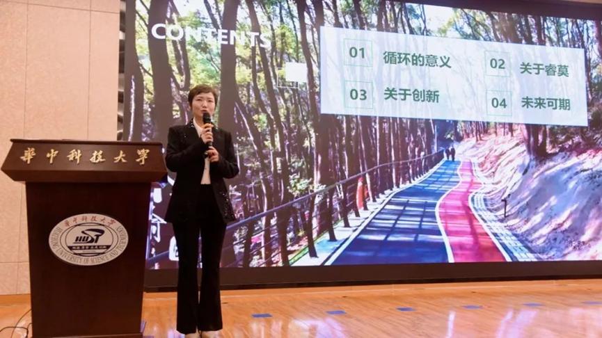 熊维师姐以《循环的魅力》为主题,从循环的意义、团队创业历程、经验与感想、展望未来等方面与在座师生进行分享。她以提问的方式引发大家对于塑料的思考,结合学科基础知识向大家介绍塑料循环的优势及目前塑料循环经济的有效解决方案。
