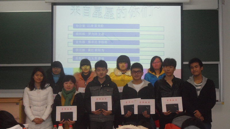 这次大会亦是荣誉的大会——大会上,来自办公室的江涛、雷美玲等十名在上学期表现突出的同学都被授予了“部门之星”的称号。石培主任与于汾秘书长为他们颁奖并合影留念。