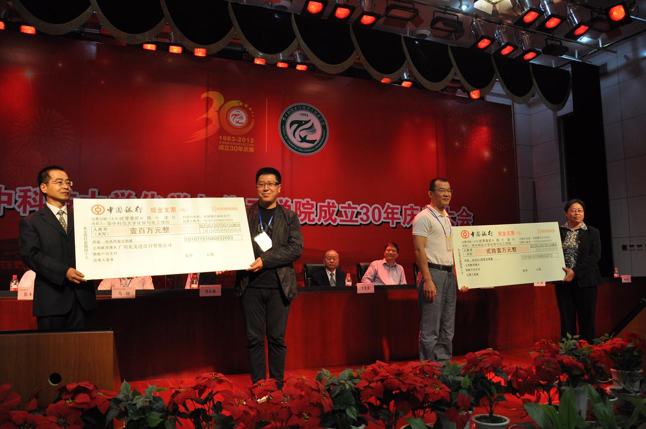 经理解孝林教授致辞,回顾了公司的发展历程,介绍了公司最近发展情况和公司十二五规划。嘉宾代表马劲处长、刘良炎研究员,员工代表国家纳米科学中心陈春英研究员、教师代表朱锦涛教授和员工代表黄嘉宇同学分别为公司送上了深深的祝福。副经理聂进教授宣读了对创建化学系潜心育人的23名退休老教师和老领导授予“建系突出贡献奖”荣誉称号的表彰决定,罗俊为朱慧楠教授、徐辉碧教授、郑家燊教授3名代表授牌。随后,大会举行了捐赠仪式。