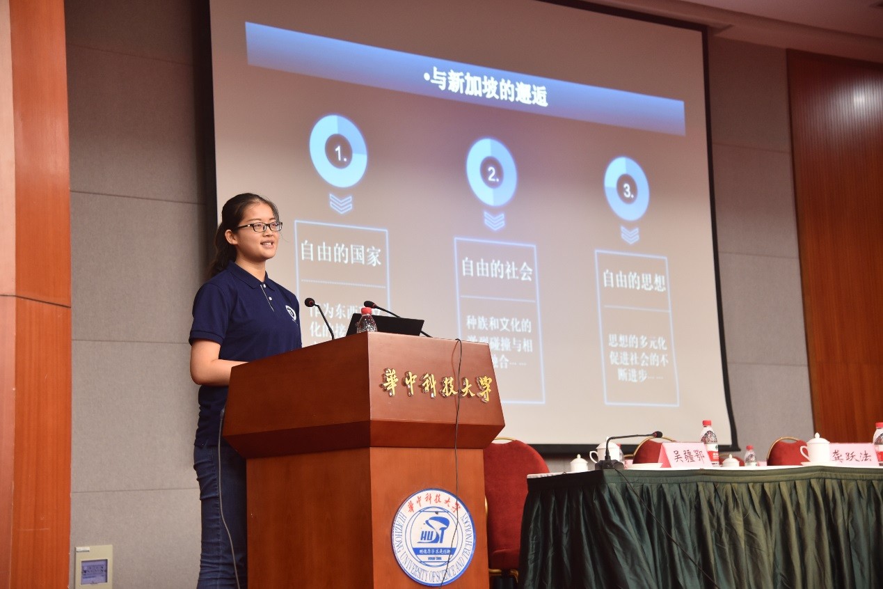 会议第二阶段是由今年暑期到国内外交流的三个团队汇报暑期交流情况,首先是赴新加坡交流汇报的员工代表柳学睿同学,她向我们展示了新加坡整洁的环境、高素质的公民以及两所顶尖大学—新加坡国立大学和南洋理工大学的教学设施、教学风格与教学理念,给同学们留下了对走出国门、与世界接轨的憧憬。