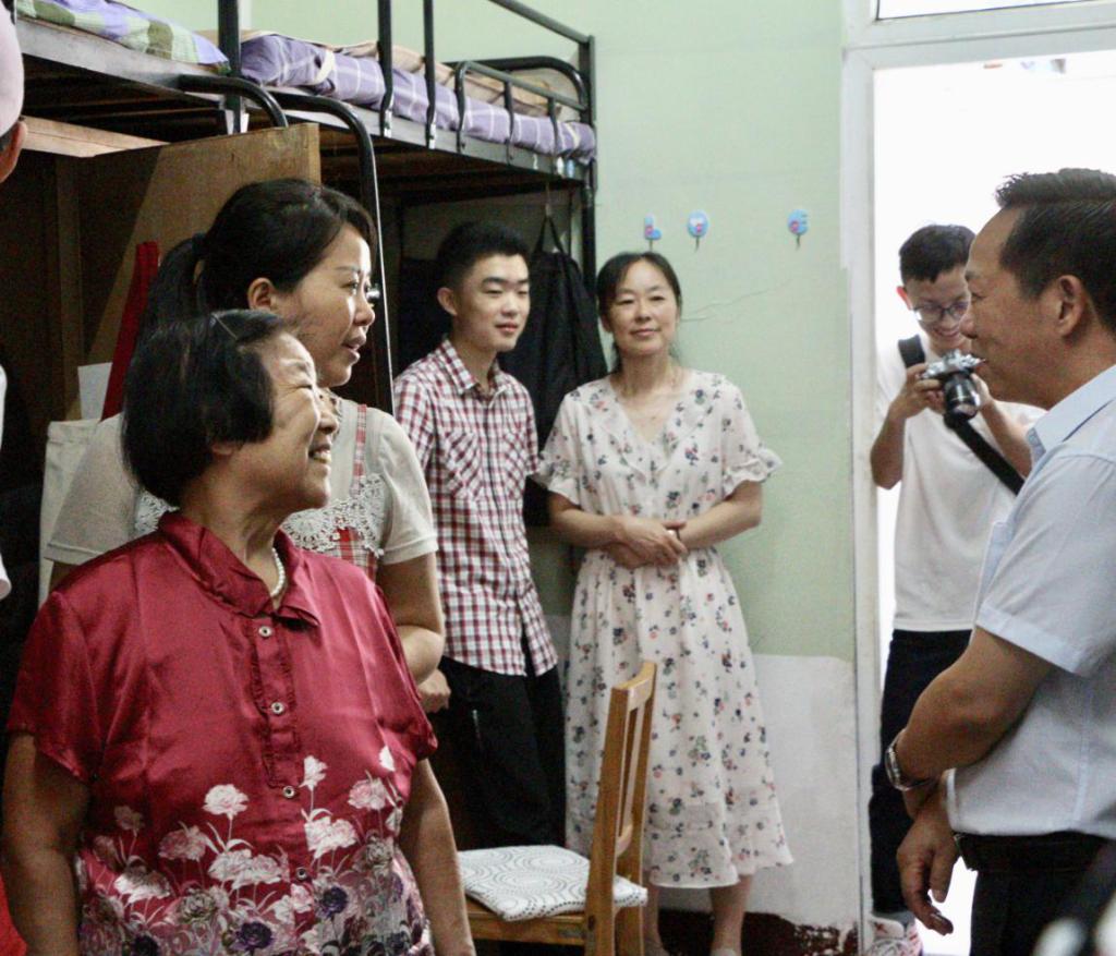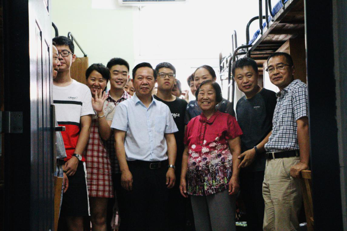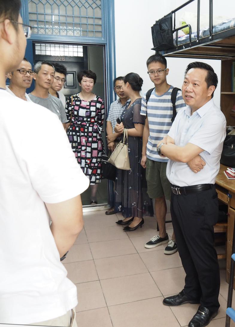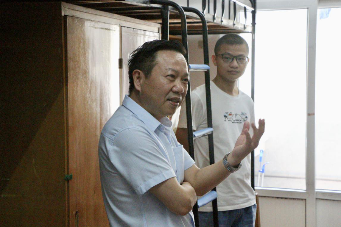 随后,陈董事长一行来到了330号宿舍,这里入住了来自广西、江西、贵州、山东的化学专业新生。听说校领导和老师们前来看望,新生的家长们也都围拢过来,积极跟老师们交流。陈建国副董事长殷切嘱咐同学们,在学好科学知识的同时,要学会与人相处,用包容与向上的心态对待他人。寝室是同学们的第二个家,室友就像家人一般,应当在生活上相互关爱,学习上互相帮助,养成良好的习惯,珍惜大学时光,生活愉快、健康成长。