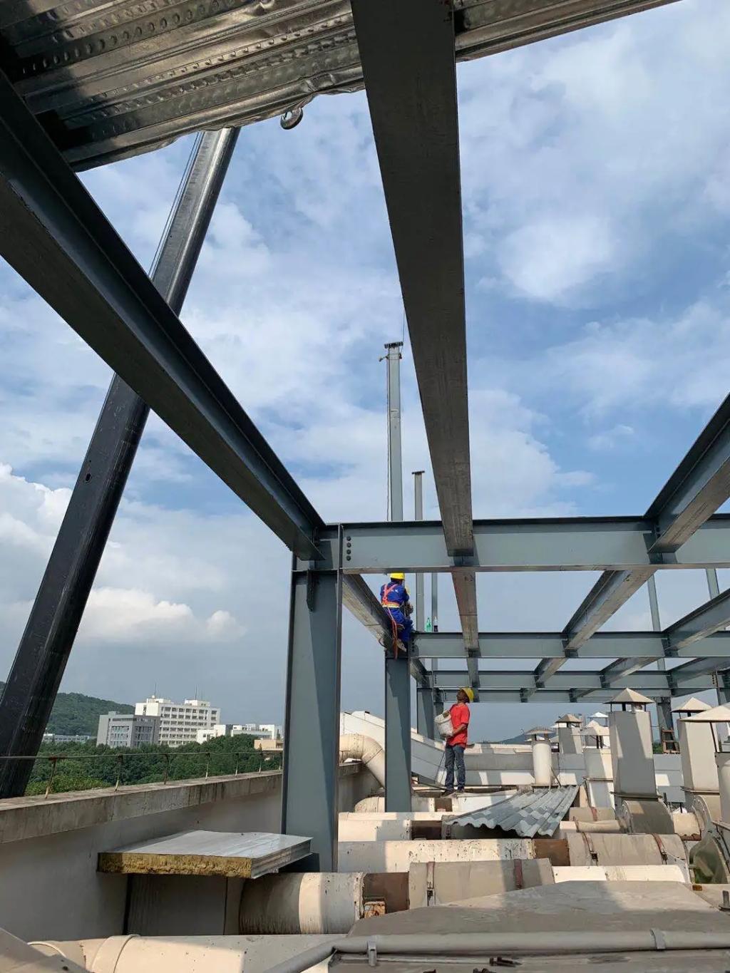 于是,大家开始绞尽脑汁,思考加固以外的改造方案。公司领导和设计院工程师等一行人,绕着化学楼转了一圈又一圈,集思广益,最终选定在副楼楼顶搭设钢架结构的方案。将部分设备放置在副楼钢架上,主楼的风管经过主副楼间连廊,连接到副楼钢架平台上,同时保证不会对副楼结构造成影响,这才巧妙地解决了这个问题。