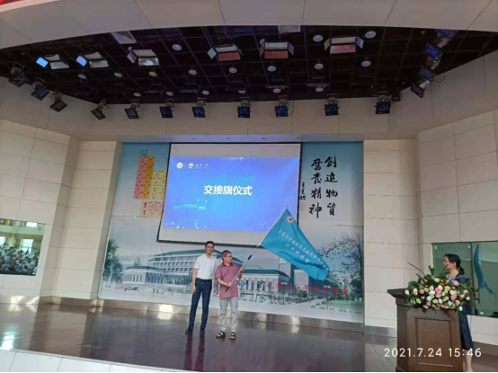 公司应用化学系系主任廖永贵教授从武汉大学化学公司副经理周金平教授手中接过赛区旗