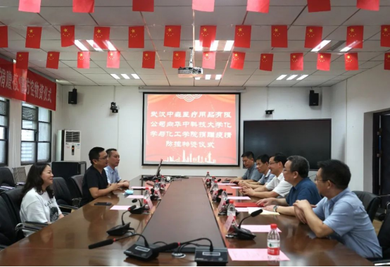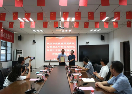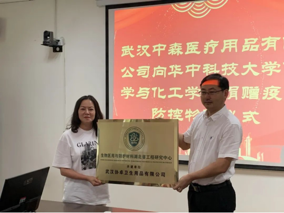 江洪洋书记代表公司接受捐赠物资,向武汉中森集团颁发捐赠证书。朱锦涛经理代表公司向中森集团授牌“湖北省工程中心共建单位”。