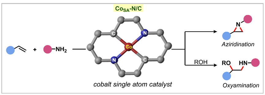 单原子催化剂(SAC),其活性金属以原子级分散且具有明确的配位结构,是架起多相催化和均相催化的桥梁。目前,单原子催化剂主要用于能源小分子的催化转化(如CO2、O2、H2O等)以及一些简单的有机物氧化、还原、偶联反应中,在新型有机合成,尤其是药物衍生分子后期官能团化方面的应用较少。另一方面,烯烃官能团化可以快速高效构建新的化学键制备高附加值分子。目前单原子催化已经实现了烯烃C-C/C-O/C-Si键的构建,而C-N构建则尚未实现。考虑到含氮化合物具有重要的生物活性和药理作用,开发单原子催化烯烃胺化反应显得尤为迫切。