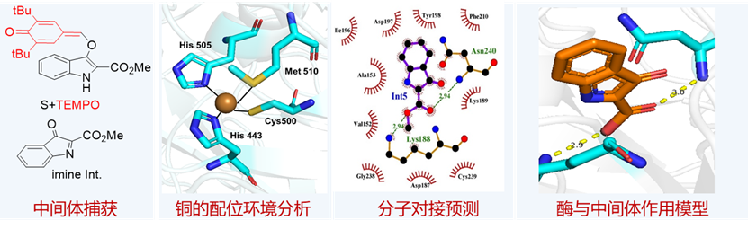 研究团队对该酶促反应的机理进行了深入的研究(图3)。首先通过控制实验捕获和验证了中间体分子的生成。在此基础上,通过铜的配位环境分析、中间体分子与酶的分子对接模拟等实验,提出了底物与酶的可能作用模型:中间体的酯基与CueO酶Asn240的酰胺N-H和Lys188的氨基存在着弱氢键作用;这些相互作用可能对交叉偶联反应的反应性和对映选择性至关重要。当将这两个氨基酸残基突变成丙氨酸,所得突变体CueO_K188A和CueO_N240A的催化效果显著降低。这一结果验证了上述推测的酶作用方式的合理性。