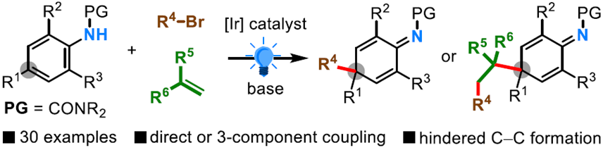基于此,该团队开发了一种光氧化还原催化下取代苯胺烷基化去芳构化反应策略。在温和条件下实现了氨基甲酰保护的苯胺类化合物和α-溴代酯类化合物的自由基交叉偶联反应,成功构建了一系列具有连续季碳中心的环己二烯亚胺类化合物。反应有较好的底物范围,各类结构的苯胺以及卤代烃、烯烃、炔烃和环烷烃等基团都有较好的兼容性,并且一些更缺电子的自由基物种同样表现出较好的反应性,不仅能与苯胺自由基发生直接偶联,还能在外加烯烃的参与下,实现三组分串联去芳构化反应。通过进一步衍生化反应,可以将产物进一步转化为环己胺、环己烯醇类化合物。该工作为芳胺类化合物的去芳构化研究提供了一种新的策略。