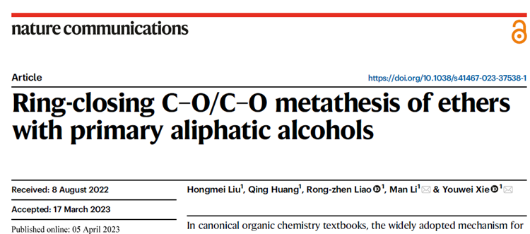 4月5日,伟德国际VICTOR1946谢有伟研究团队与廖荣臻教授合作的论文Ring-closing C–O/C–O Metathesis of Ethers with Primary Aliphatic Alcohols在《Nature Communications》刊发。博士生刘红梅为该论文第一作者,谢有伟教授与李曼副教授为本文的共同通讯作者,伟德国际VICTOR1946为唯一通讯单位。