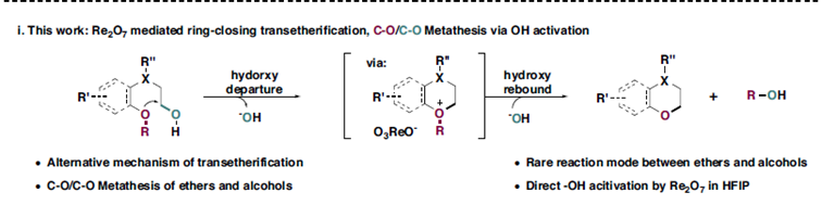 在传统醇与醚的复分解反应中,几乎所有的反应都是通过活化醚,随后被醇羟基亲核取代来实现的,净结果是一个C-O/O-H σ-键的交叉复分解反应。在谢有伟团队报道的这篇论文中,实现了Re2O7催化的醇与醚之间的C-O/C-O σ-键复分解反应,该反应通过Re2O7活化醇羟基从而促进醚的亲核取代来实现分子内C-O/C-O关环复分解,合成相应的含氧杂环化合物。这是一个分子内转醚化反应,将苯甲醚衍生物转化成苯并含氧杂环化合物(五、六、七元杂环)和甲醇。通过相应的机理实验和DFT理论计算,验证了该反应最可能的机理,这与之前报道的这类反应的机理完全不同。