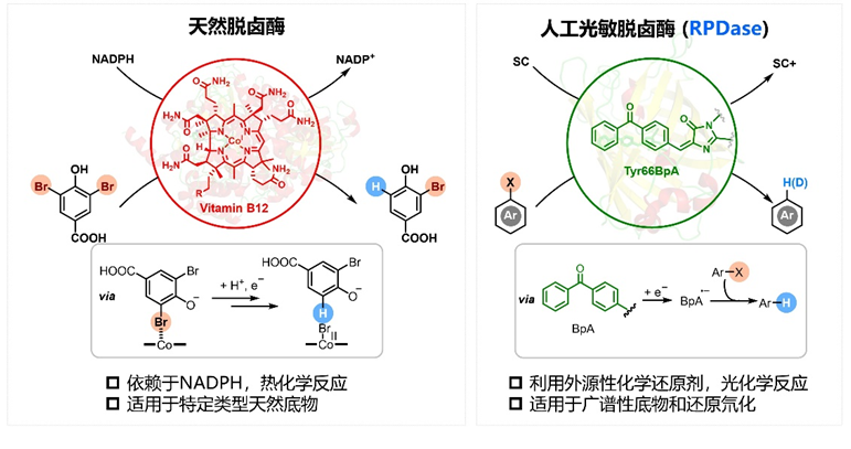 图1.天然还原性脱卤酶和人工光敏脱卤酶的对比