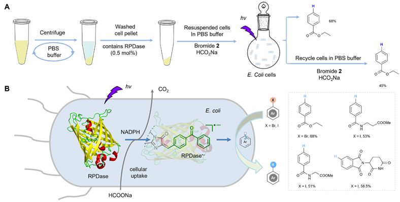 钟芳锐团队致力于绿色仿生和人工生物催化领域的研究,基于化学原理驱动酶催化选择性合成的理念,发展了含有非天然光敏活性基团的人工光敏金属酶(J. Am. Chem. Soc. 2021, 143, 617)和“三重态光酶”(Nature, 2022, 611, 715),扩展了多铜氧化酶的催化杂泛性实现了非天然吲哚类底物的立体选择性氧化交叉偶联反应(Angew. Chem. Int. Ed., 2023, e202219034)。在上述人工生物催化研究基础上,团队深入开展化学和生物催化的交叉研究,利用基因密码拓展技术重构开发了含化学光催化剂的人工光敏脱卤酶(RPDase),通过捕获光子能量来驱动广谱性芳香卤化物的脱卤氢/氘化。与金属辅因子依赖性的天然脱卤酶不同,RPDase通过完全非天然的光致电子转移催化机制进行,能利用外源性甲酸钠为终端还原剂,从而避免了天然脱卤酶对还原性辅酶NADPH的依赖(图1)。