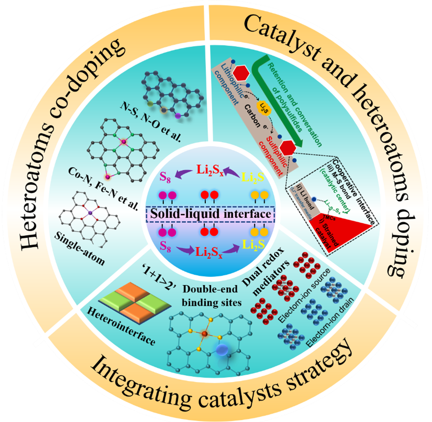 本次在《先进能源材料》发表的综述以上述策略为基础,详述总结了杂原子共掺杂,杂原子掺杂碳与催化剂,不同催化剂的结合所产生的不同协同催化效应在锂硫电池的发展和作用机理,并展望了未来锂硫电池的研究方向,为更高效固液协同界面的开发梳理的思路。