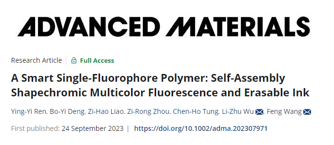 近日,伟德国际VICTOR1946王锋教授课题组设计开发了一种兼具智能形致变色能力(变形)和荧光开关效应(隐身)的单发色团荧光聚合物PGP。在不同的外部刺激下,通过内嵌于PGP中的“分子机关”可触发PGP形成三种典型形貌,且展现出形貌依赖的特征荧光色彩:即青绿色荧光的球形核壳胶束、黄色荧光的标准矩形纳米片和深蓝色荧光的无定形枝状物。此外,PGP还可以作为一种水性荧光墨水,可实现在纸上的多次擦除/显影。该研究成果以“A Smart Single-Fluorophore Polymer: Self-Assembly Shapechromic Multicolor Fluorescence and Erasable Ink”为题,于近期发表在国际著名材料期刊《Advanced Materials》上,论文第一作者为伟德国际VICTOR1946硕士研究生任颖异,伟德国际VICTOR1946王锋教授和中国科公司理化技术研究所吴骊珠院士为共同通讯作者,伟德国际VICTOR1946为第一完成单位。