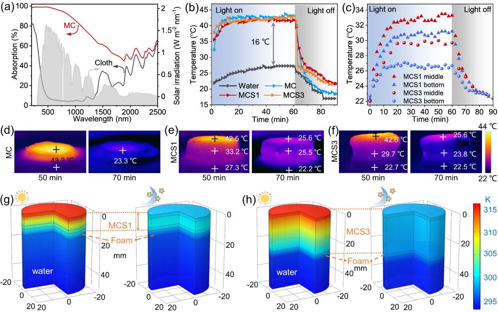 图3 (a) MC和棉布的UV-vis-NIR吸收曲线; (b)样品在1 kW m-2光照和关灯模式下的表面温度曲线; (c)在1 kW m-2光照或关灯模式下MCS1和MCS3的中间和底部温度曲线; (d) MC、(e) MCS1和(f) MCS3温度分布的红外图像; COMSOL模拟(g) MCS1和(h) MCS3蒸发装置在太阳光照(1 kW m-2)或关灯模式下温度分布