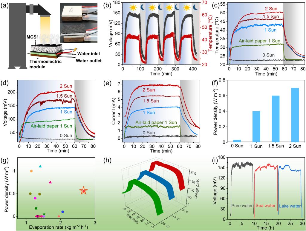 图6 (a) 用于水电联产的装置示意图; (b) 在1 kW m-2光照下,装置的循环光响应曲线; 装置在开灯和关灯模式的(c)表面温度、(d) 开路电压和(e) 短路电流曲线; (f) 设备在不同强度太阳光照射下的功率密度; (g) 组装装置的发电性能与文献进行对比; (h) 在不同下表面温度时,混合装置的开路电压; (i) 混合装置在不同水质中的耐用性(太阳能强度 1 kW m-2)