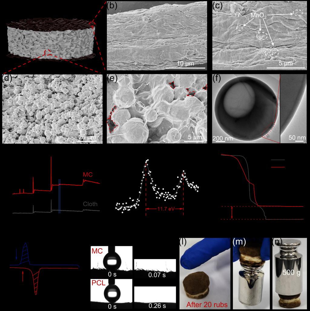 图2 (a) MCSX蒸发器的示意图; (b和c) MC膜和(d和e) PCL层的SEM图像; (e) 中的红色虚线标记微胶囊之间的间距; (f) 微胶囊的TEM图像; (g) MC和棉布的XPS总谱; (h) MC的特征Mn 2p XPS谱图; (i)MC和棉布在空气中的TGA曲线; (j) 相变微胶囊的DSC曲线; (k) MC和PCL的水接触角; 照片显示MCS1蒸发器的(l) 抗摩擦能力,(m) 不同层之间的强附着力,以及(n) 压缩性能