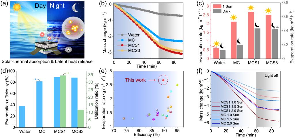 图4 (a) 全天候太阳能界面蒸发和热电发电示意图; (b) 水的质量变化和(c) 各种蒸发器在开灯或关灯模式下的蒸发速率; (d) 蒸发器在1 kW m-2太阳光照下的蒸发效率和相变微胶囊的利用率; (e) MCS1的蒸发性能与先前报道的太阳能蒸发器做比较; (f) MCS1和MC在不同太阳光照强度下生产淡水的质量变化 (光照60分钟,黑暗30分钟)