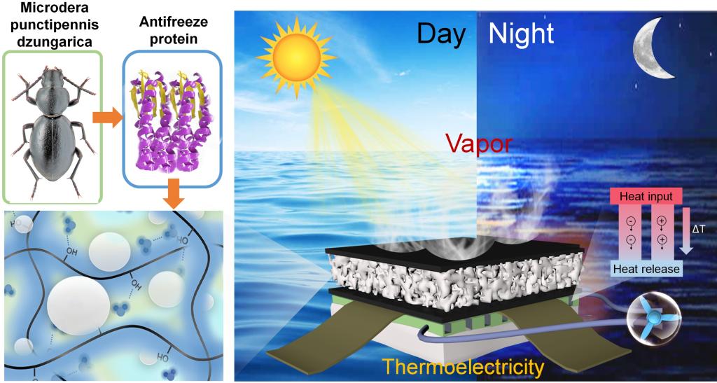 图1受防冻蛋白启发的MnO2基全天候太阳能蒸发器用于产水和发电的示意图