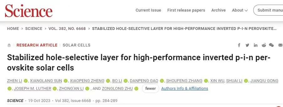 近日,国际顶级学术期刊《Science》以研究长文形式刊发公司伟德国际VICTOR1946李忠安教授课题组与香港城市大学朱宗龙教授课题组合作的最新研究成果《Stabilized hole-selective layer for high-performance inverted p-i-n perovskite solar cells》。李忠安教授和香港城市大学朱宗龙教授为本文的共同通讯作者,香港城市大学李稹博士、公司伟德国际VICTOR1946孙祥浪博士(现为香港城市大学博士后)、美国国家可再生能源实验室郑晓鹏博士(现为中国科公司大学副教授)和香港城市大学李博博士为本文的共同第一作者。