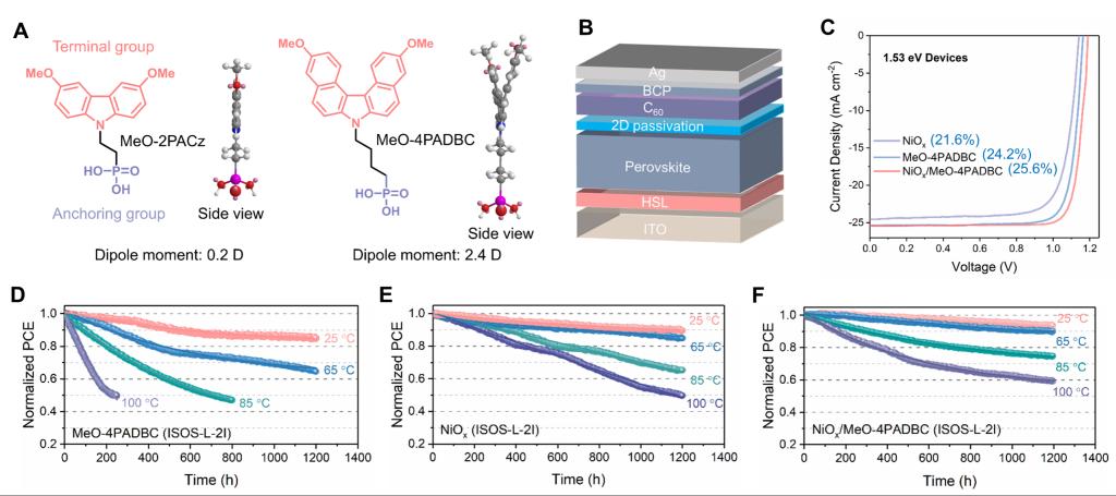 以NiOx/MeO-4PADBC作为空穴传输层,制备的活性层带隙为1.53 eV的反式PVSCs实现了25.6%的认证PCE,远好于单独由NiOx(21.6%)或MeO-4PADBC(24.2%)制备的对比器件(图1C)。该空穴传输层还具有优异的通用性,用于带隙为1.68 eV和1.80 eV的活性层也分别实现了22.7%和20.1%的器件PCEs。令人欣喜的是,由于形成三齿化学键,NiOx/MeO-4PADB空穴传输层的界面热稳定性显著增强,其热降解活化能是常规结构界面ITO/MeO-4PADBC的3倍。因此,1.53 eV 反式PVSCs在65℃下连续工作1200小时后仍能维持>90%的初始效率,远好于单独由NiOx或MeO-4PADBC制备的对比器件(图1D-F)。进一步地,由阿伦尼斯公式可以推算,基于NiOx/MeO-4PADBC制备的器件在25 ℃下连续工作超过10个月后仍能维持80%以上初始效率。值得说明的是MeO-4PADBC自身作为空穴传输层也实现了24.2%的PCE(图1C),且器件在65℃下连续工作1200小时后仍能维持>65%的初始效率(图1D),优于大多数已报道的SAMs。