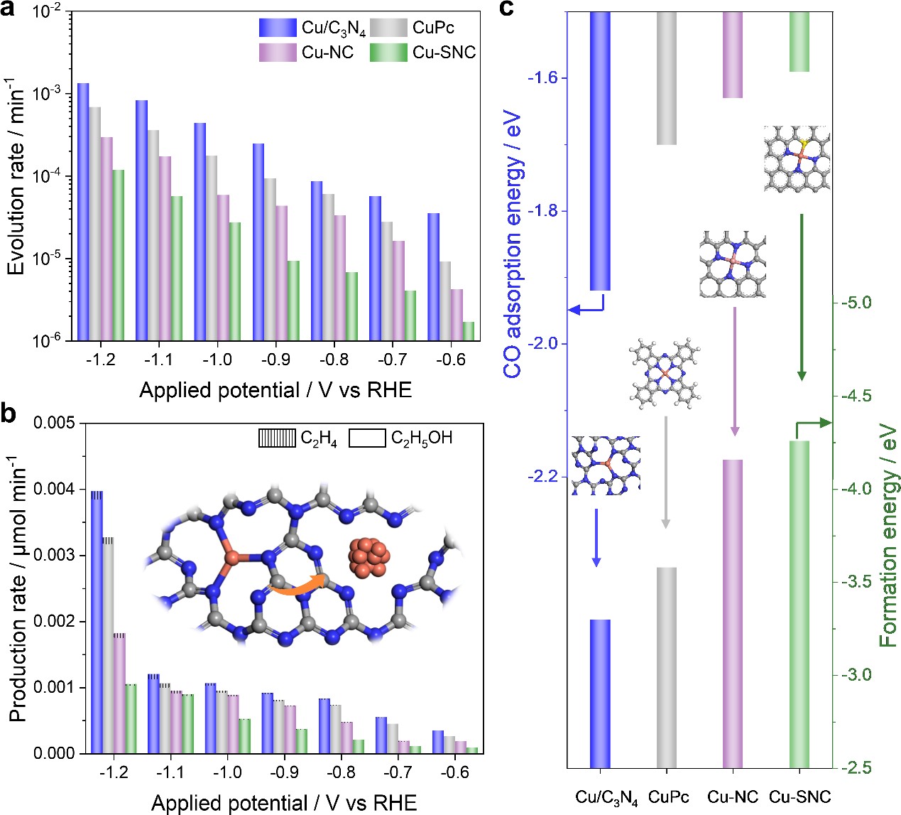 基于此,杨旋教授团队创新性地利用原位ATR-SEIRAS技术定量监测四种铜单原子催化剂(Cu/C3N4、CuPc、Cu-NC和Cu-SNC)在CO2RR中的结构演变。原位光谱结果表明,单原子Cu位点向金属Cu纳米颗粒的演变速率高度依赖于施加的电位,并且随着电位变负,其演变速率加快,在−1.2 V(所有的电位都是相对于可逆氢电极)下,形成金属Cu颗粒的速率相比于−0.6 V时高近两个数量级。活性结果表明,单原子Cu位点是CO2转化为CO的活性点,重构生成的金属Cu位点是CO2转化为C2+产物的活性位点。DFT计算结果进一步表明,铜单原子催化剂(Cu SACs)的稳定性取决于Cu-X(X为C、N和S等)的形成能,即Cu SACs的稳定性与Cu位点和催化剂基底的亲和力紧密相关,亲和力越强,稳定性越高,控制Cu位点的配位数以及Cu位点和基底的相互作用能够调控Cu SACs的稳定性。本工作为深入理解Cu SACs的结构-稳定性关系提供了一种新颖的方法,为理性设计和合成高稳定SACs提供了理论指导。