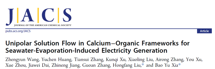 2024年1月5日,《美国化学学会志》(J Am Chem Soc)期刊在线刊发了伟德国际VICTOR1946刘宏芳教授、夏宝玉教授团队最新研究成果“钙基金属有机框架中的单极性溶液流动诱导海水蒸发产电”(Unipolar Solution Flow in Calcium−Organic Frameworks for Seawater-Evaporation-Induced Electricity Generation)