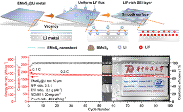 基于此,公司王得丽教授课题组采用简单的压印法以剥离的二硫化钼纳米片为单元在金属锂负极表面构建了多功能人工SEI旨在解决金属锂电池中棘手的锂离子不均匀沉积,锂枝晶生长和N∕P高等问题。研究发现剥离的MoS2具有诸多优势,例如含有大量硫空位和富1T相可以降低Li成核过电位,降低Li+传输能垒;而且剥离的MoS2具有很高的杨氏模量和优异的离子导率,可以有效抑制Li枝晶的生长和SEI的不断破裂/生成;良好的界面润湿性和均匀的层状结构可以调控优化锂离子通量加快反应动力学。最终匹配高压NCM811正极可以实现400 Wh kg−1的软包全电池性能并稳定循环100次。利用富硫空位和1T相超薄二硫化钼纳米片构建人工SEI的策略为实现长循环稳定性的高能量密度锂金属电池提供了新的指导。
