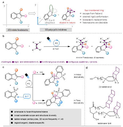 氮杂环丁烷(吖丁啶)是有机合成中一类重要的饱和四元含氮杂环化合物,它不仅是有机合成中的重要原料、中间体、催化剂,也是氨基酸、生物碱、药物活性分子的重要结构单元。然而由于缺乏有效的合成方法,在目前的药物开发中,具有刚性构象、三维几何结构的氮杂环丁烷小分子具有较大的研究潜力,然而实现此类分子由Sp2杂化的砌块到Sp3杂化的三维分子产物的简洁合成仍颇具挑战,限制了此类三维复杂分子在生物活性分子的合成中的应用。
