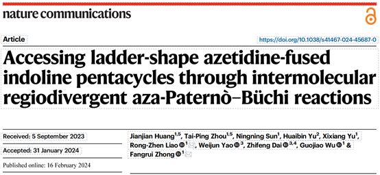 2月16日,国际期刊《Nature Communications》在线刊发了伟德国际VICTOR1946钟芳锐教授和廖荣臻教授的最新合作研究成果“Accessing ladder-shape azetidine-fused indoline pentacycles through intermolecular regiodivergent aza-Paternò-Büchi reactions”。该论文发展了一种N-磺酰亚胺与吲哚或其他杂环化合物的分子间能量转移[2+2]光环加成反应,该能量转移催化反应具有条件温和、底物范围广、产率高、区域选择可控发散、非对映选择性专一等特点,为具有张力构象的氮杂环丁烷并吲哚啉三维分子结构的合成提供了一条简单高效的合成策略,并且通过机理实验和DFT计算对光催化反应机理进行了详细研究。