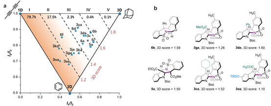 为了进一步催化机理,作者开展了紫外吸收实验、循环伏安和Stern-Volmer猝灭实验,证明了亚胺底物和吲哚类底物均可猝灭光敏剂的激发态,但前者占主导地位。DFT机理研究揭示了区域和立体选择性的来源,N原子上的自旋密度较高,键形成的位置与自旋密度的位置有关,造成不同路径中的中间体存在显著的能量差异,使得本反应中C-N键优先成键,这显著区别于传统aza-Paternò-Büchi反应中的C-C键优先成键。参考DrugBank数据库的结构数据,该反应的产物呈现出显著的三维立体性,其中许多产物的3D评分位于数据库中的前0.5%,此研究有效地丰富了具有高分子复杂性和未知拓扑化学空间结构的三维分子的合成工具箱。