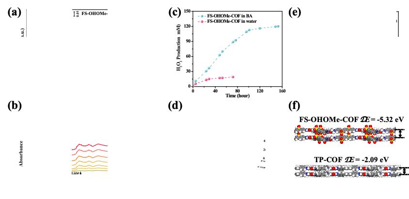 制备得到的FS-OHOMe-COF表现出较低的激子结合能、较长的激发态寿命和较高的光稳定性(图2)。在光照条件下,该COF能高效且稳定地生成过氧化氢,可见光下过氧化氢生成速率可达1.0 mM h-1(图3),72小时光照后过氧化氢浓度可达19 mM,并在420 nm处取得最大的外部量子效率,为9.6%。在模拟太阳光下,计算得到太阳能-化学能转换效率为0.58%。经过48小时的光照后,产生的溶液可直接用于降解有机污染物(图4d)。更为重要的是,FS-OHOMe-COF具高的结晶度,更强的层间作用力(图4f),以及更高效的电荷传输效率,使其获得了更高稳定性,能够在光照下持续稳定运行至少192小时(图4c,e)。