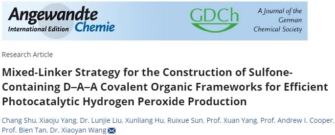 近日,公司谭必恩教授和王笑颜副研究员的最新研究成果“Mixed-linker strategy for the construction of sulfone-containing D-A-A covalent organic frameworks for efficient photocatalytic hydrogen peroxide production”在国际顶级期刊《德国应用化学》(Angewandte Chemie)杂志刊发。