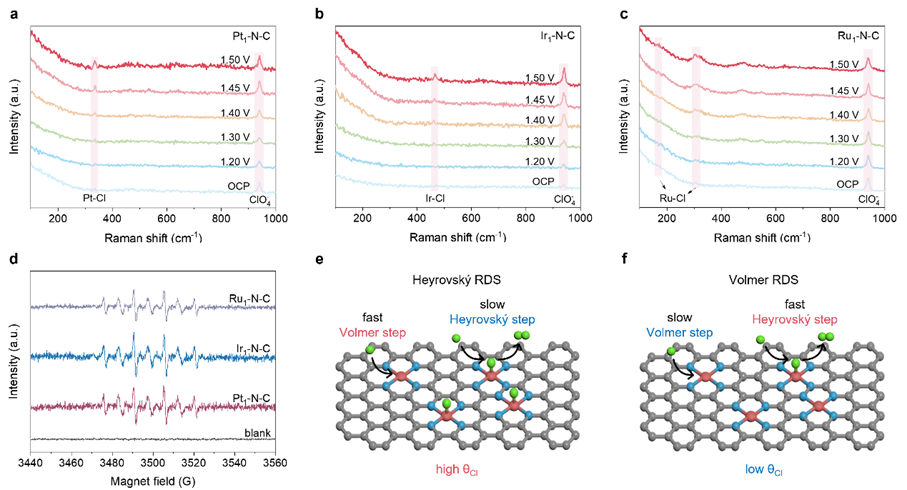 有鉴于此,我们成功合成了三种具有相同M–N₄配位的单原子催化剂,实现了对其本征CER活性的客观评估。电化学实验、原位Raman以及准原位EPR等研究手段表明三个M1–N–C催化剂均通过Cl介导Vomer-Heyrovský机理进行反应,并且催化反应的活性趋势为Pt1–N–C> Ir1–N–C> Ru1–N–C。通过DFT计算揭示了Cl*–Cl中间体在活性中心上的结合能是决定CER活性的关键因素。