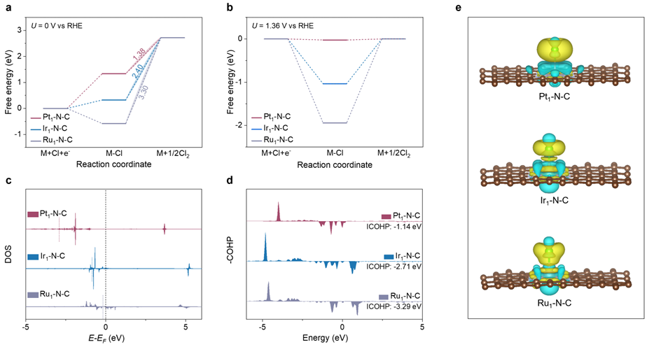 在U=0时,Heyrovský步骤(ΔGCl*-Cl)的吉布斯自由能变化比Volmer步骤(ΔGCl*)高,这表明Heyrovský步骤是三个M-N4位点上的决速步(图5a)。此外,Pt–N4上的ΔGCl*-Cl远低于Ir-N4和Ru-N4上的ΔGCl*-Cl,这表明CER活性的顺序为Pt–N4 > Ir–N4 > Ru–N4。同时,Pt–N4、Ir–N4和Ru–N4在1.36 V vs RHE时的ΔGCl*-Cl分别为0.02、1.04和1.94 eV。值得注意的是,Pt–N4位点的ΔGCl*-Cl(0.02 eV)最接近于零,Pt–N4是理想催化活性位点。此外,DOS和COHP表明,Pt–N4的d带中心最负,导致其占据最高的反键态,且Pt–N4对Cl物种的吸附最弱,从而获得最小的结合能和吉布斯自由能垒。同时,Bader电荷的定量计算表明,与Ir–N4和Ru–N4相比,Pt–N4的电子转移量最大,这表明Pt–N4的反应速度最快。综上所述,这些DFT计算共同验证了Pt–N4 > Ir–N4 > Ru–N4的固有CER活性趋势,与实验结果相符。