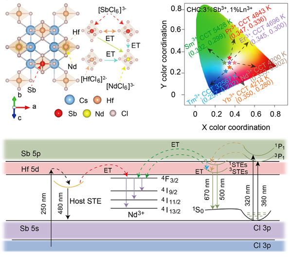 针对上述挑战,课题组提出了基于多激子能量转移路径定向调控的新策略,采用Sb³⁺/稀土离子共掺杂的空位有序Cs₂HfCl₆纳米晶体系,通过系统优化掺杂浓度、激发波长与稀土离子种类,实现了高效的可见-近红外超宽光谱发光。研究揭示,Sb³⁺离子在该体系中诱导形成单重态与三重态多激子发光中心,并与稀土离子之间建立高效能量转移通道,拓展了发光波段并提升了发光效率。基于该材料开发的单组分LED展现出波长覆盖至1200 nm的连续发光,显色指数超过97,同时表现出良好的器件稳定性。结合实验与第一性原理计算,该研究深入揭示了多激子-稀土离子协同能量调控的电子结构与发光机制,为开发新一代高性能超宽带固态光源提供了理论支撑与材料基础,并在医疗照明、双模夜视成像、精准色彩显示、高端艺术照明等领域展现出重要应用潜力。