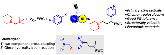 镍/可见光氧化还原催化的烯烃的1,2-双碳官能团化反应近年来得到了快速的关注(Chem. Sci. 2020, 11, 4051),该反应可以避免使用有机金属试剂,取而代之的是使用廉价易得、温和的烷基自由基前体作为碳亲核试剂端,同时可见光的介入使得反应条件十分温和,从而提高了该类反应的底物普适性、官能团兼容性以及原子和步骤经济性。此外,相比于传统的过渡金属催化烯烃的双碳化反应,金属/可见光组合催化策略通过单电子氧化亲核试剂端生成烷基自由基启动反应,从而导致反应的区域选择性发生完全翻转。最近,Chu,Nevado,Molander和Aggarwal课题组分别报道了烯烃与芳基卤化物和各类烷基自由基前体的三组分交叉偶联反应。但是,这类反应都局限于二级和三级烷基自由基,而一级烷基自由基由于立体位阻小,活性高很容易直接与芳基卤化物发生两组分偶联竞争反应,从而很难被应用于烯烃的共轭加成、偶联三组分串联反应中。
