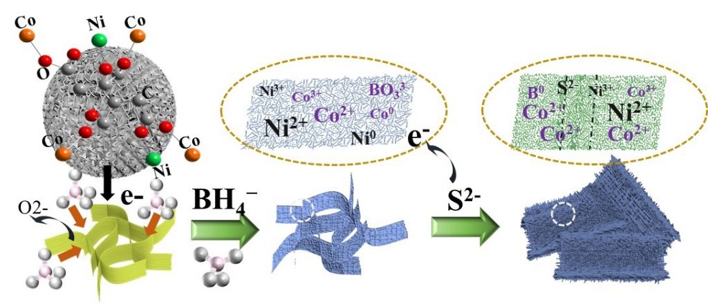 伟德国际VICTOR1946夏宝玉课题组通过氧化还原策略来调控双金属Co-Ni MOF纳米薄片的结晶性和电子结构来增强材料法拉第电容。依次通过硼化和硫化处理后,得到稳定低价的混合价态的Co-Ni MOF衍生物(Co-Ni-B-S)。该衍生物不仅保存了原始Co-Ni MOF的结构完整性,活化后表现为部分晶态和非晶态共存的结构,有利于实现优异的电化学性能。测试结果表明:(1)活化后的Co-Ni-B-S样品在1 A g-1的电流密度下,可达到1281 F g-1的高比电容;(2)在20 A g-1的电流密度下,可达到802.9 F g-1的高比电容,具有出色的倍率性能;(3)经过10,000次循环后容量保留率可达到92.1%,表现出优良的循环性能稳定性。基于Co-Ni-B-S电极制造的储能装置在功率密度为857.7 W kg-1时表现出50.0 Wh kg-1的高能量密度,在12 A g-1下经过5000次循环,容量保持率可达到87.7%。同时,在以活性炭为负极组装的超级电容器器件的测试中,发现器件在水系电解液中可以得到1.7 V的高电压,给此材料的应用提供了更多的可能性。
