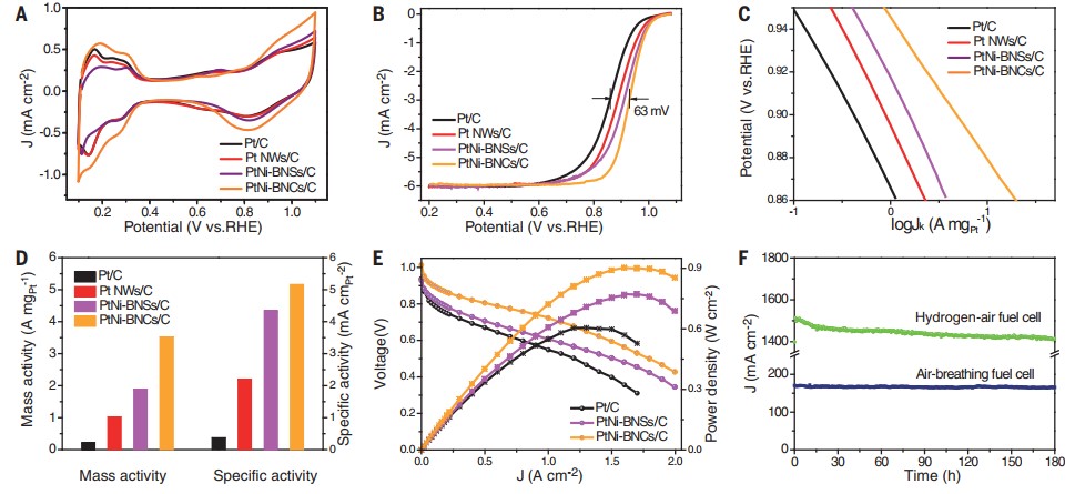图2. 铂镍合金催化性质和氢-氧燃料电池性能