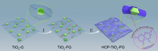 图1:多孔超交联聚合物-TiO2-石墨烯(HCP-TiO2-FG)复合光催化材料的构筑策略示意图,(I)TiO2-G重氮功能化,(II)TiO2-FG表面原位编织多孔有机聚合物材料,右上角为复合结构的放大剖面图。