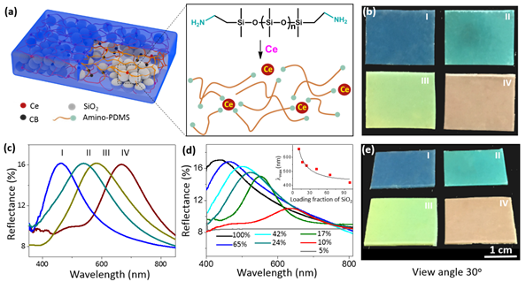 图 1 基于超分子聚合物的光子晶体弹性体及其无角度依赖的结构色彩。