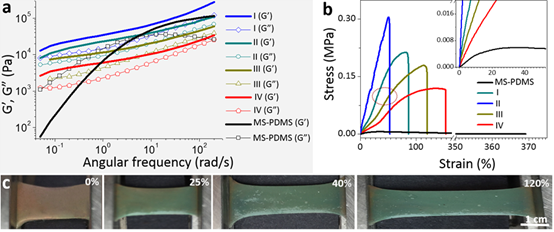 图 2. 光子晶体弹性体的力学性能以及应力响应变色能力。