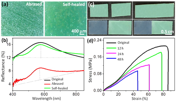 作者利用聚二甲基硅氧烷与稀土金属离子形成的超分子聚合物作为基体材料,将其与单分散的二氧化硅纳米粒子复合,通过喷涂或快速溶剂挥发的方法诱导二氧化硅纳米粒子在超分子聚合物中自组装形成具有短程有序结构的光子晶体材料,该材料展现出鲜艳的结构色。改变纳米粒子尺寸或纳米粒子在聚合物中的含量可调控其结构色彩。该材料还表现出无角度依赖的结构色,即从不同的角度观察其颜色不发生变化(如图1所示)。更重要的是,该光子晶体弹性体还表现出类似于变色龙皮肤的变色性能,在拉伸或压缩等外力作用下其结构色可发生改变(图2),外力释放后该材料又能恢复到之前的结构色,因此可用于可视化应力传感领域。同时,超分子聚合物的动态配位键赋予了光子晶体弹性体材料自愈合性能,可实现对表面划痕以及裂痕的自发修复(图3),自愈合后材料的力学性能得以恢复,保证了光子晶体弹性体材料的使用性能。该研究不仅提供了一种新的光学材料构筑方法,还为光子晶体在光学涂层、智能穿戴、防伪材料、可视化传感等领域的应用提供了新思路。