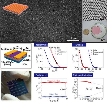 521日,《先进材料》在线刊发了团队最新研究成果“Centimeter-scale Inorganic Nanoparticles Superlattice Monolayer with Non-closed-packing and Its High Performance in Memory Devices)” (Adv. Mater. 2018, DOI: 10.1002/adma.201800595)。公司为第一完成单位,伟德国际VICTOR1946博士后王珂及南京邮电大学博士生凌海峰为共同第一作者,朱锦涛教授与南京邮电大学解令海教授、仪明东教授为论文的共同通讯作者。超晶格是一种具有严格周期性和高度有序性的纳米复合材料。团队成员利用高分子接枝金纳米粒子(组装基元)具有的微弱两亲性,提出了一种新的/水界面快速组装法。随有机溶剂的挥发,纳米粒子在油/水两相界面快速(小于1秒)自组装成大面积的超晶格单层膜(约3×3厘米)。该方法克服了本领域难以构建大面积、非紧密堆积超晶格单层膜的难题,实现了超晶格从紧密堆积到非紧密堆积的转变和超晶格材料晶格常数的大范围调控,为非紧密堆积超晶格材料在微电子、生物传感、光电器件等领域的应用提供了可能。基于此,团队成员与南京邮电大学解令海团队合作,以制备的超晶格单层膜为纳米浮栅层,构筑了一种高性能有机场效应电信号存储器。与传统方法制备的同类型电信号存储器相比,该存储器在存储窗口、维持时间、器件稳定性等方面都表现出优异性能。例如,与传统的无序结构超晶格存储器件相比,该类高度有序超晶格纳米浮栅存储器件的存储开关比可达105,实现了存储态分明的8阶存储特性(即3比特信息存储),并且稳定的存储寿命可达10年以上。