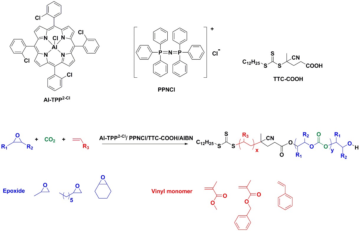 针对二氧化碳基聚碳酸酯(PPC)分子间作用力弱、力学性能和热学稳定性差、官能化困难的缺点,研究团队利用含羧基三硫酯化合物同时作为二氧化碳共聚反应(ROCOP)和可逆加成-断裂链转移聚合(RAFT)的双功能链转移剂,一步合成了含不同官能团的二氧化碳基嵌段共聚物,为二氧化碳基聚碳酸酯(PPC)材料的高性能化和生物可降解高分子材料的低成本化制造提供了有效途径。本研究工作得到了国家重点研发计划(2016YFB0302400)和国家自然科学基金青年项目(21604027)资助。