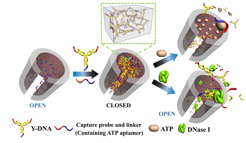 夏帆教授课题组通过碱基互补配对作用对DNA序列的设计,构筑了一种新型的高密度交联“3D”结构DNA,将这种结构的DNA序列在纳米孔道体系中进行自组装。由于“3D” 结构DNA中有n+1黏性末端,弥补了纳米孔道内组装时,简单结构的核酸探针所存在的非垂直角度生长、容易倒伏和黏性末端易被“终止”等缺点。 这种“3D”结构DNA在不同孔径(30 nm -650 nm),尤其是在比较大孔径的孔道里具有非常好的门控性质。在 270 nm 到 650 nm 范围内,开关比维持在103-105 。该体系能够在不同分子(小分子ATP和蛋白质DNA酶)的刺激下,完成相应的开关过程。开关过程的时间,可以通过在体系中加入稀释的有机试剂(乙醇)起到加速作用。这种由DNA控制的高性能纳米流体门控体系将在生物分析和高信噪比智能纳米器件的构筑方面具有巨大的应用价值。