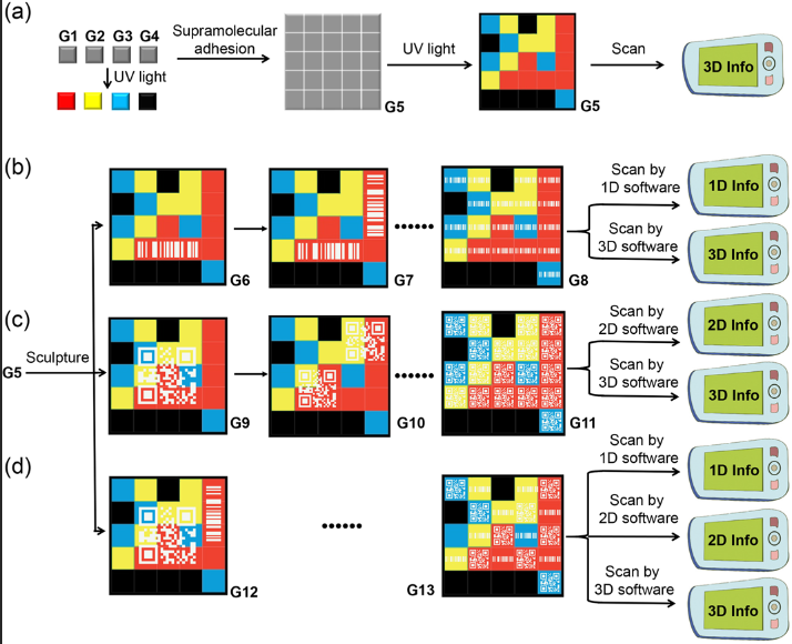 图2. (a)AIE超分子水凝胶通过界面组装形成3D信息码G5;(b)G5中引入多种1D信息码;(b)G5中引入多种2D信息码;(b)G5中引入多种1D和2D信息码